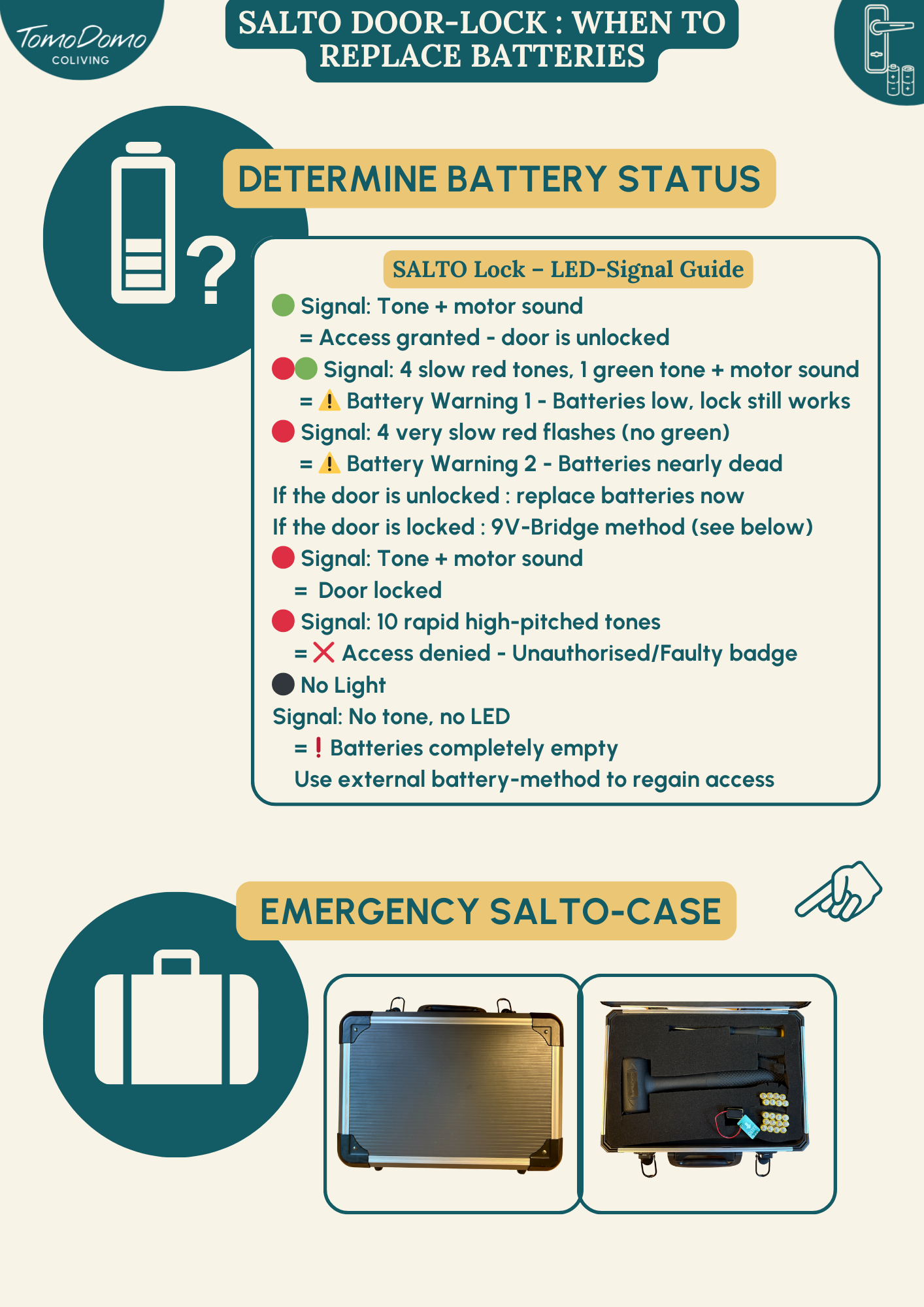 - Reagiert dein Schloss nicht, könnten die Batterien leer sein. In diesem Fall kannst du mit dem SALTO-Notfallkoffer wieder Zugang erhalten und die Batterien ersetzen. Wenn du unsicher bist, prüfe den Status des SALTO-Schlosses